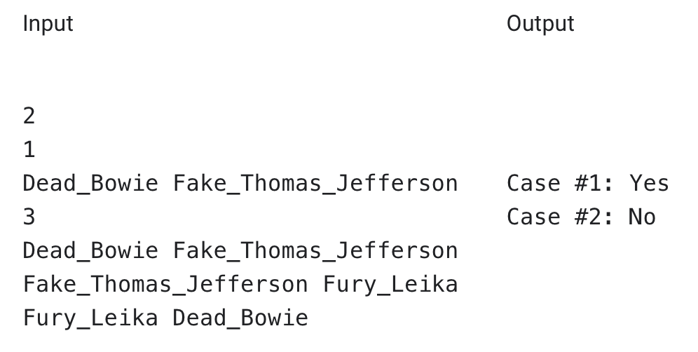 The first line of the input gives the number of test cases, T. T lines follow. Each test case start with a positive integer M on a line by itself, followed by M pairs of troublesome villains (one pair per line, separated by spaces.)