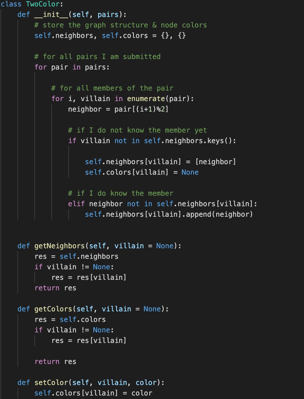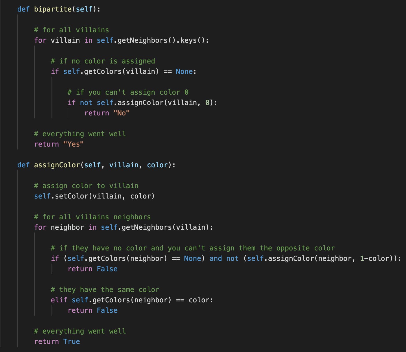 The code literally translates this into these two methods: if the color 0 can’t be assigned to the first villain, the bipartition fails. Assigning a color simply consists of updating our color dictionary and verifying that: