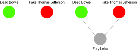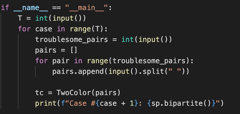 Next, we want to transform these pairs into a usable structure. During the initialization of TwoColor, two dictionaries are built: a neighbors dictionary that contains all the neighbors of each villain (the graph), and color dictionary that contains the color of each villain.